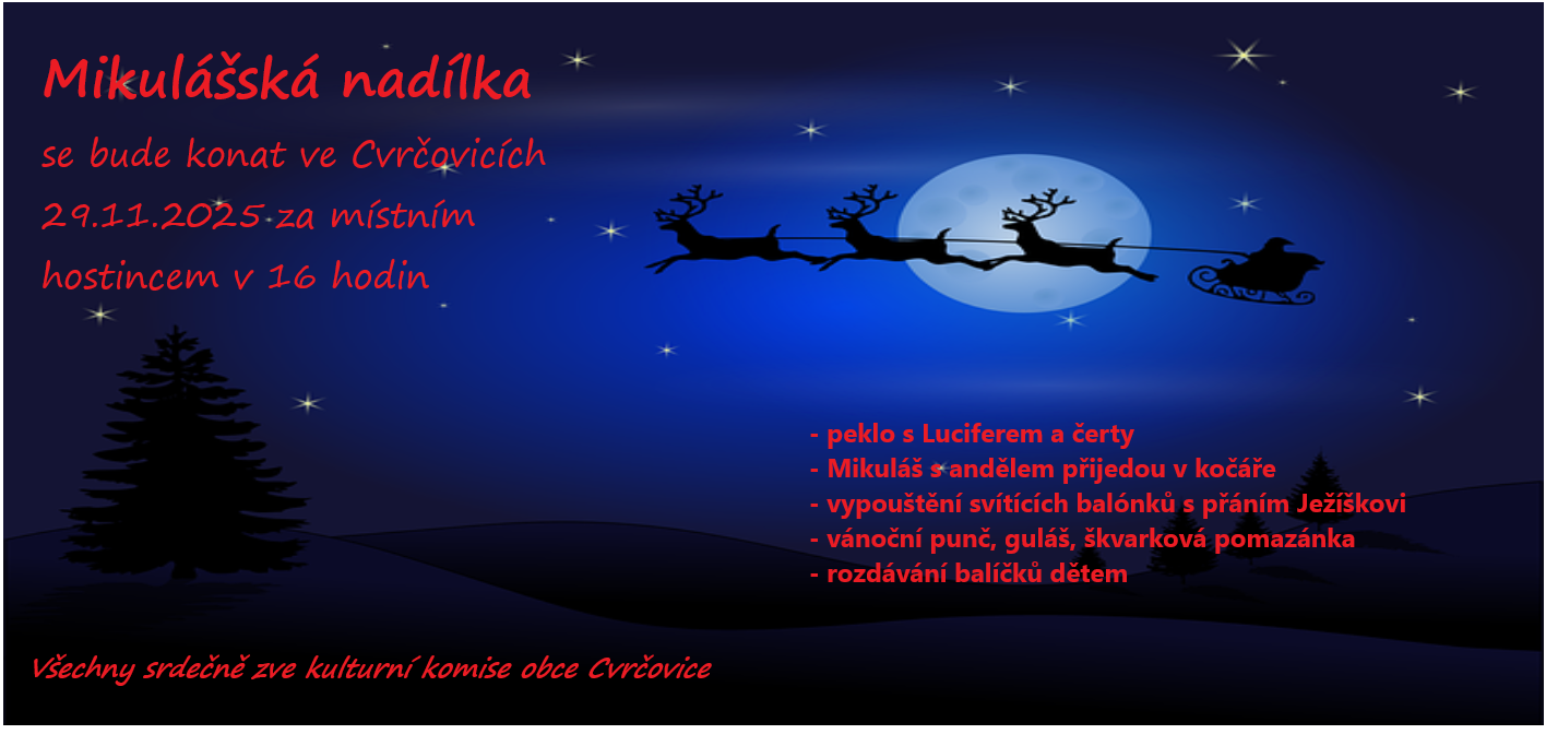 Kulturní komise obce Cvrčovice oznamuje, že do obce Cvrčovice příjede Mikuláš s čerty a andělem již 29.11.2025 v 16:00 hodin za místní hostinec. Tradičně bude zřízena pobočka pekla, teplý vánoční punč, mikulášský gulášek a balíčky pro děti. Součástí programu bude společné vypuštění světelných balónků s dopisem Ježíškovi.